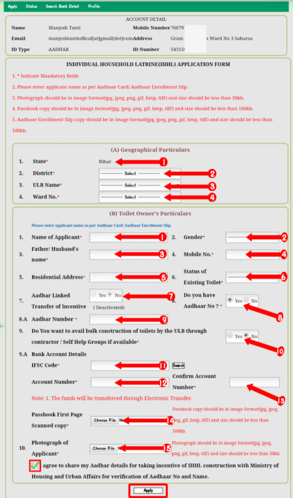 aap shauchalay ke liye Kis Tarah se aavedan karenge ki shauchalay banvane ke liye Sarkar dwara diya gaya 12000 ka rupees aapke sidhe Bank Account mein hi aaye ! is beech kisi bhi tarah ka koi Dalali nahi hoga